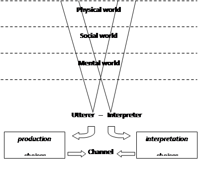 Here three layers have to be minutely discussed, those are the physical, the mental and the social worlds of the speaking partners. The physical world is the actor itself, its body with its separate body parts, surroundings, etc. The mental world is the inner world of the speaker that is not immediately visible and can be hard to detect just from the very first sight. It also undertakes within the process of communication and is very important in the decoding process as all the cultural, familial, emotional, and educational backgrounds are eventually encountered within the mental world of the speaker. And, last but not least, the social world of the speakers, that is all the other humans that are persistent in the life of the speaker, e.g. relatives, colleagues, friends, etc.