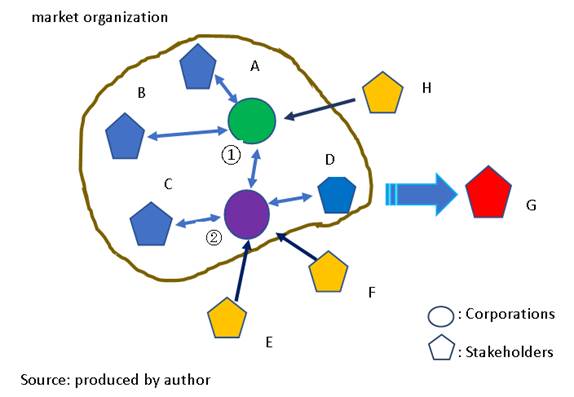 Figure 1 exhibits the structure of stakeholders in digital economies. A to G represent stakeholders and ① and ② denote corporations. A to D have trusty relation with corporations ① and ② in the framework of market organization and are classified as inside stakeholders. Digital revolution inspires corporations ① and ② to proceed cooperation and improves two way communication in the inside stakeholders. Digital economies improve efficiency in communication between stakeholders E,F,H and corporations. Before the digital revolution external stakeholders are assumed to be E to H. After the revolution the external stakeholders except G turn into outside stakeholders. Figure 1 illustrates how digital revolution creates outside stakeholders. Stakeholder G is separated from communication of the market organization and receives external effects of the organization.