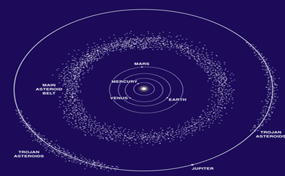 The second threat to life on Earth's surface is the existence of the Asteroid Belt in the solar system. Asteroid Belt is different sized bodies believed to have been remained since the formation of the solar system 4.6 billion years ago. They are rocky bodies of irregular shapes, and most of them are small in size. The asteroid belt lies in an area between Mars and Jupiter and is called the main belt (see figure 4.).
